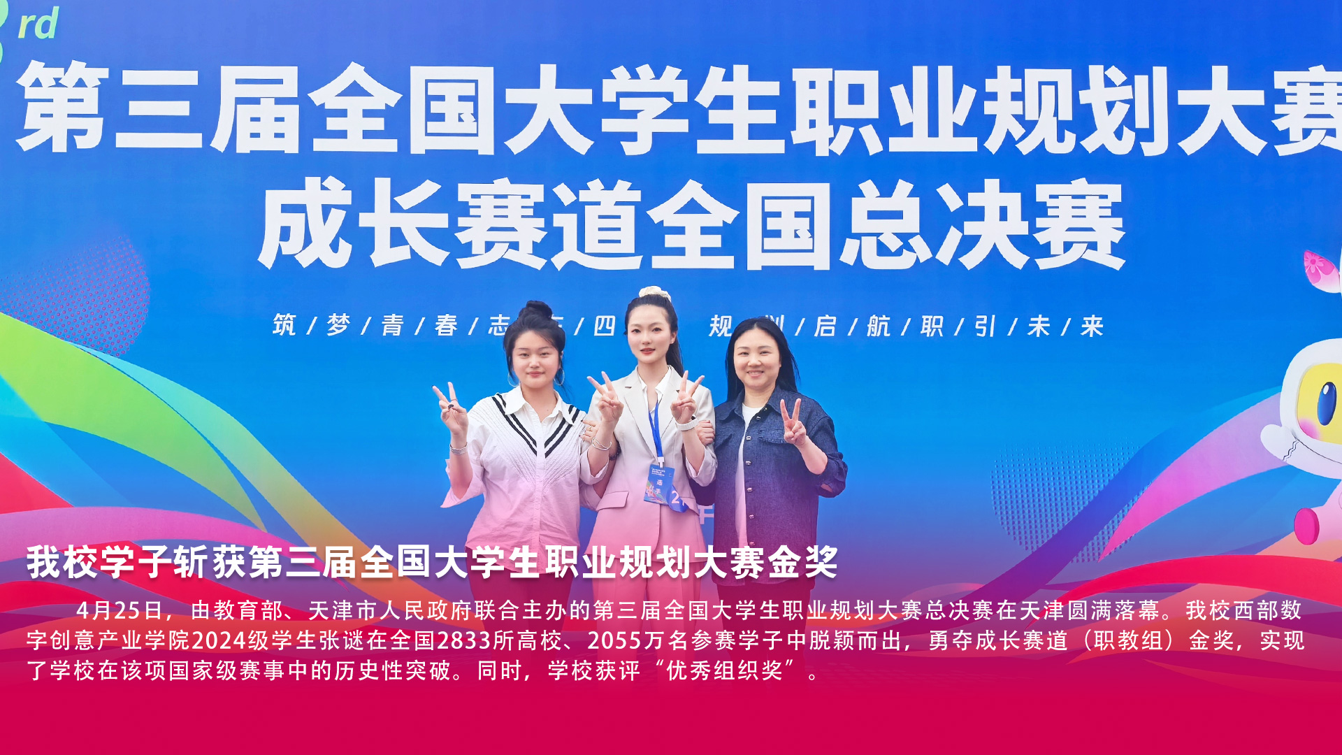 2026-044月25日,由教育部、天津市人民政府联合主办的第三届全国大学生职业规划大赛总决赛在天津圆满落幕。我校西部数字创意产业学院2024级学生张谜(指导老师:喻... -