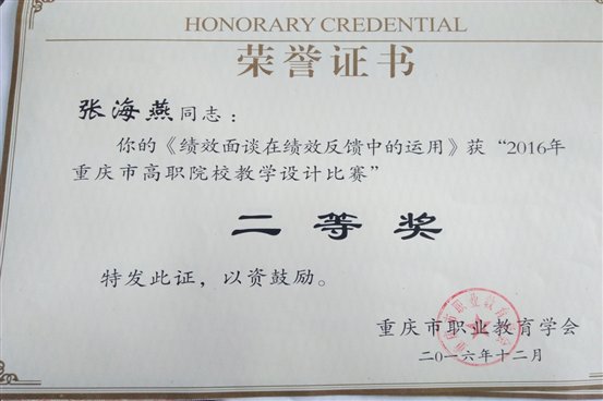 Recently, the 2016 Chongqing Designing Competitionfor Vocational College, held by Chongqing Vocational Education Association, cameto an end. Zhang Haiyan, the teacher of our college, won the second prize byher work Application of Performance Review in Performance Feedback.