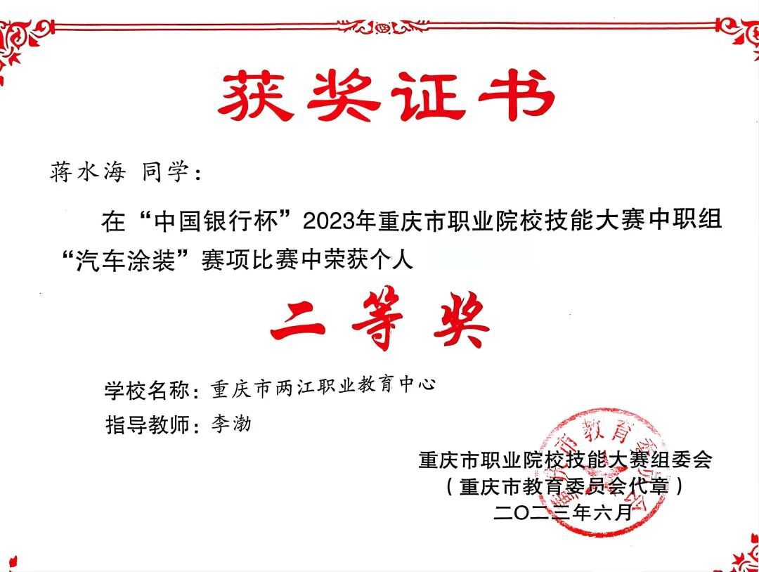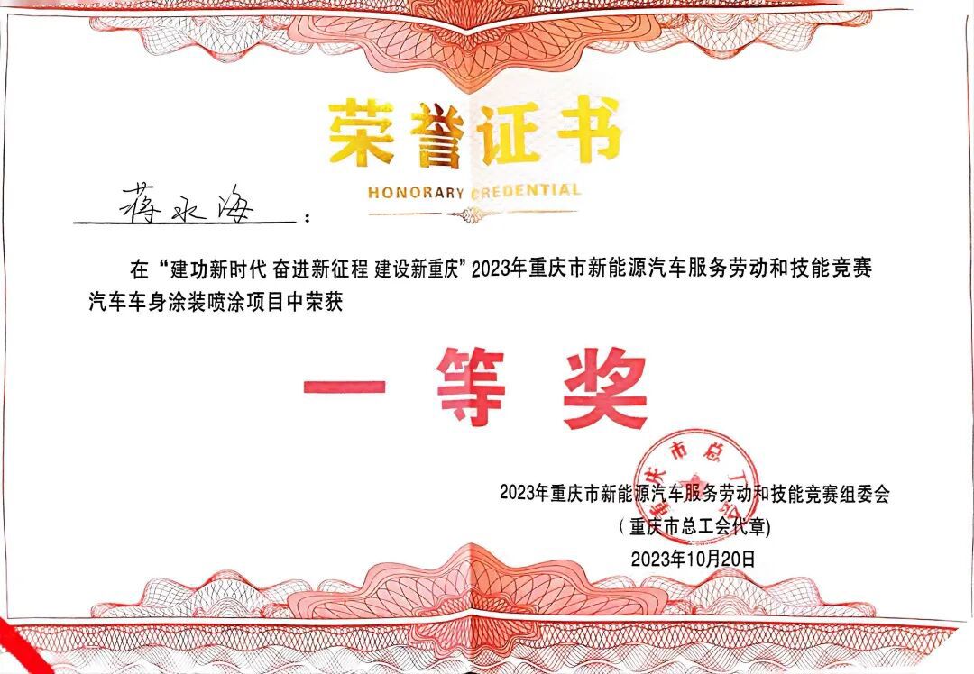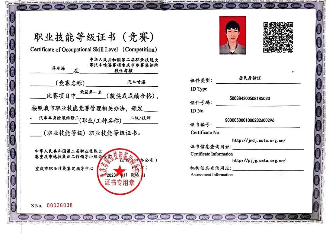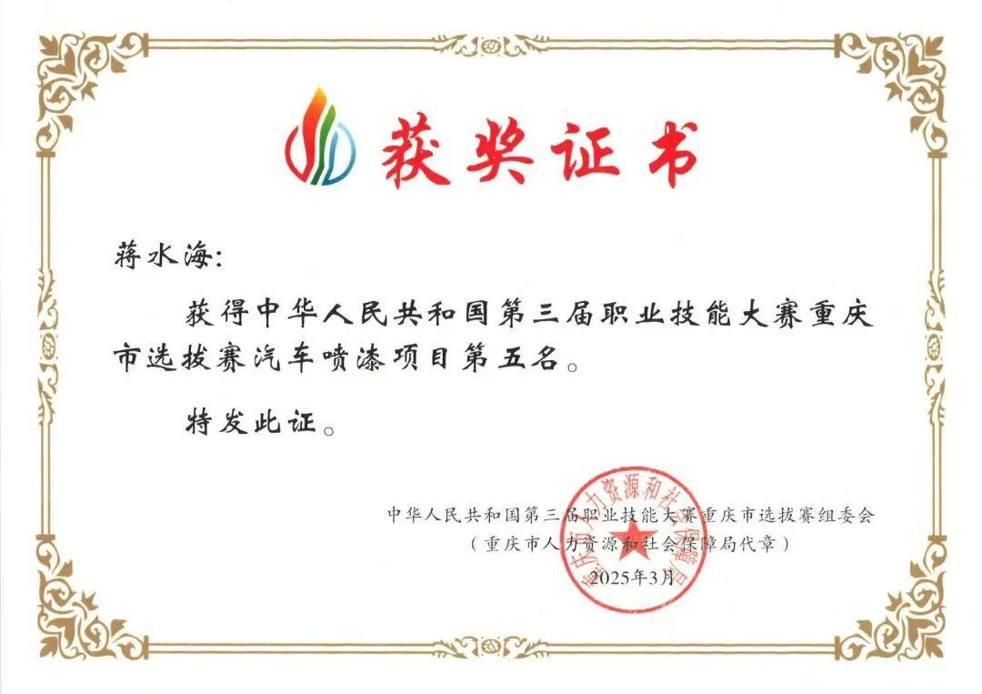 在2025年9月于河南郑州举办的中华人民共和国第三届职业技能大赛全国总决赛中,我院2024级汽车检测与维修技术专业学生蒋水海,作为重庆市在“汽车喷漆”赛项的唯一选手,凭借扎实的专业技能与稳定的现场发挥,荣获“优胜奖”,实现了学校在该项全国最高级别技能赛事中的历史性突破。