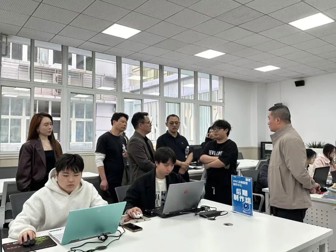 交流伊始,在学院副院长张陵及专业教师陪同下,创谷动漫一行首先前往精益楼403 AIGC数字动画制作中心。张院长详细介绍了中心硬件配置、技术优势及教学应用,重点展示AIGC技术在动画创作各环节的实操应用,现场演示AI工具对制作效率的提升,让大家直观感受学院“科技+创意”的教学特色。