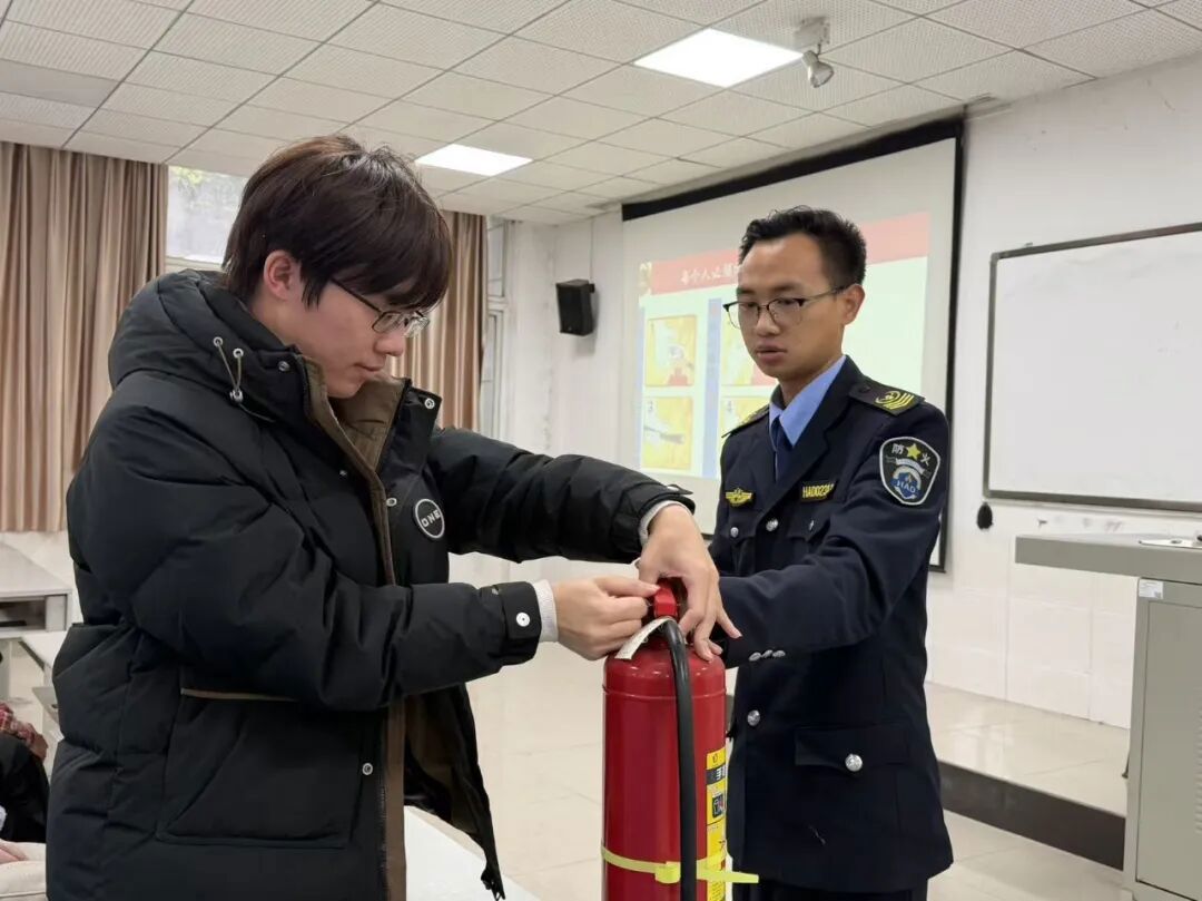 在实操演练环节,谢教官现场演示了干粉灭火器、消火栓等常见消防器材的操作步骤,并指导部分参训人员进行了“灭真火”的模拟体验。通过手把手教学,确保大家能够熟练掌握“提、拔、握、压”等关键动作要领,有效提升了面对突发火情时的实战应对能力。