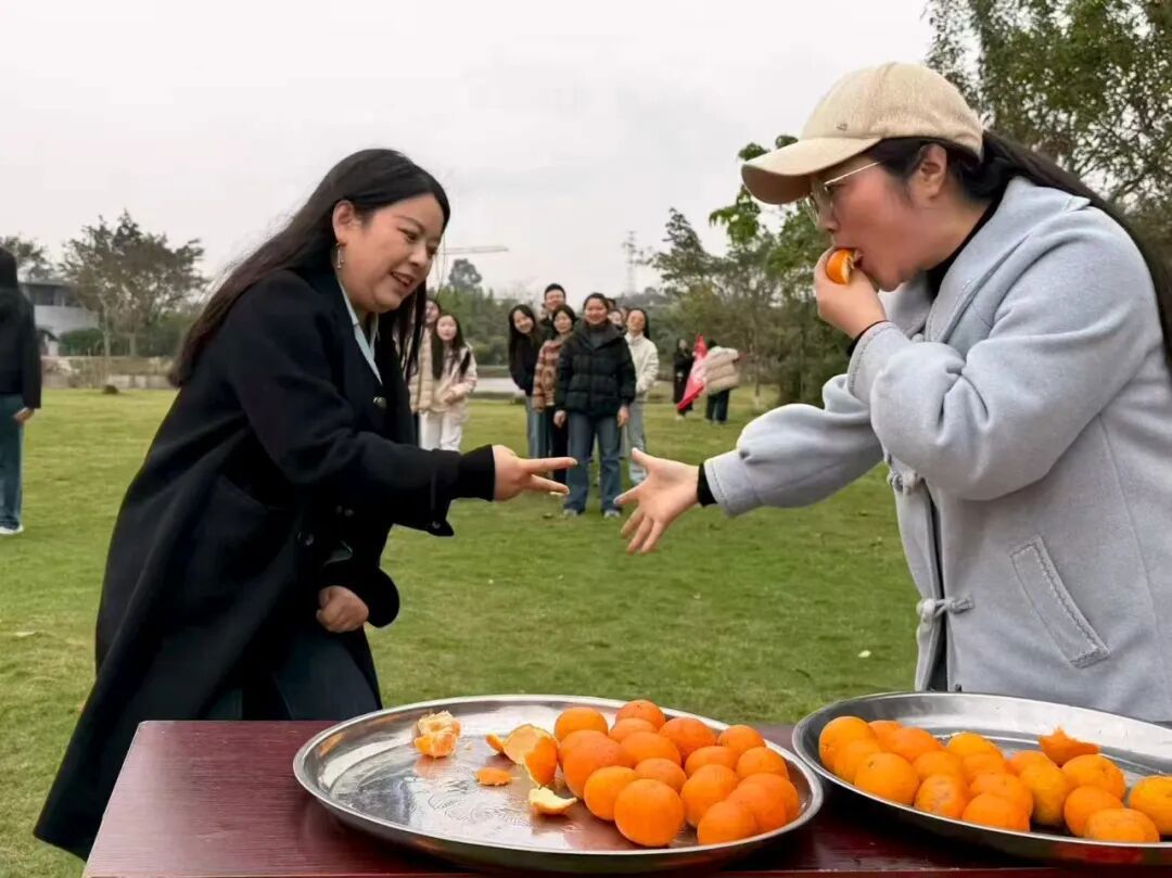 趣味吃橘子比赛将现场气氛推向高潮。老师们精神饱满、踊跃参与,默契比拼、奋勇争先,加油声与欢笑声此起彼伏,尽显活力满满、团结向上的巾帼风采。