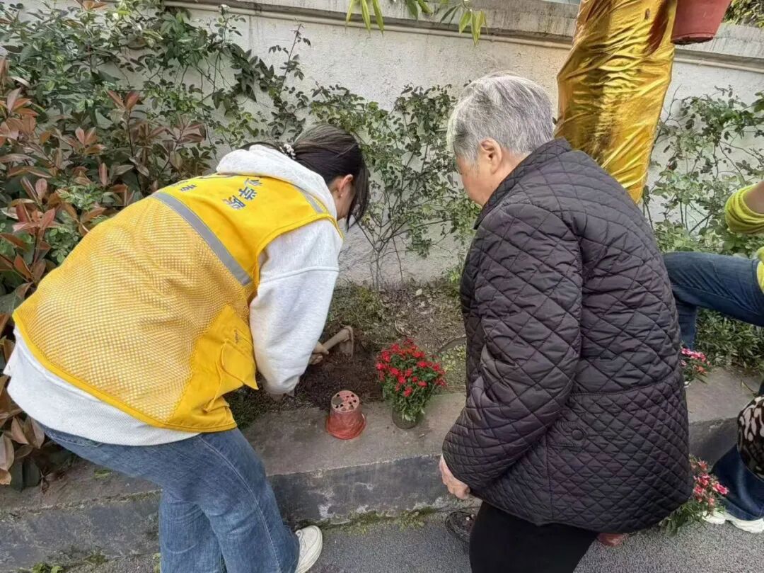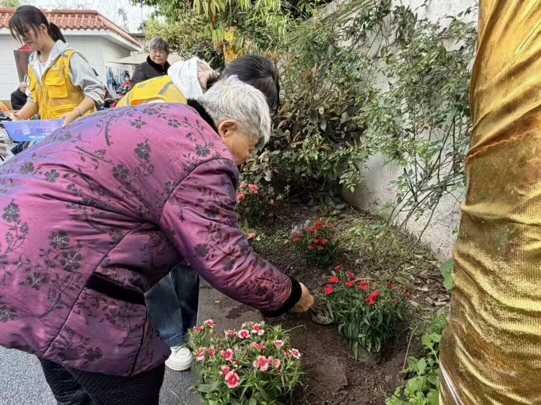 在“植绿护绿”环节,考虑到长者身体状况,工作人员准备了适老化工具和石竹花等易养护花卉。在志愿者耐心协助下,长者们轻扶花苗、培土定植、浇水呵护,动作舒缓却满怀热忱。