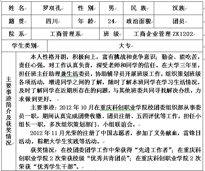 重庆科创职业学院2015年优秀毕业生——罗双孔