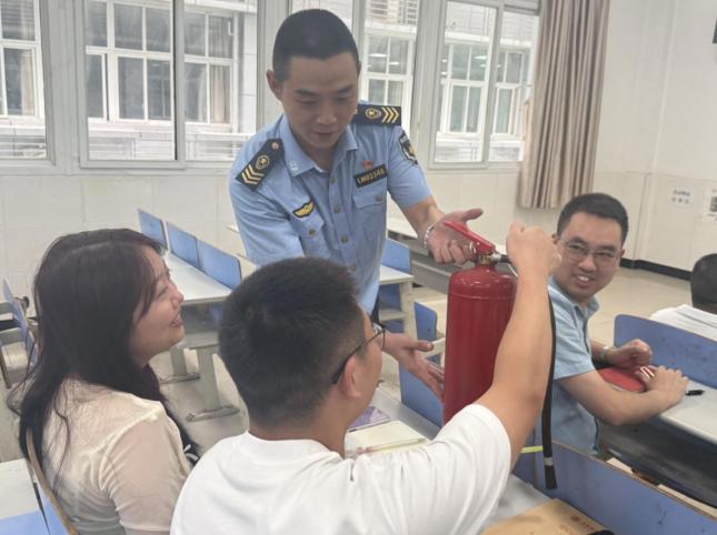 在消防教官的指导下,师生按照灭火器的正确使用方法和步骤,“提、拔、握、压”,亲身体验扑灭模拟火源的过程,整个演练过程规范有序,现场气氛热烈而紧张。