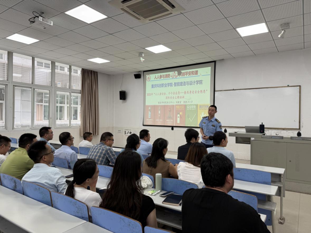 为全面提升师生的消防安全意识和应急自救能力,9月18日,智能建造与设计学院在理工楼304开展消防安全知识专题讲座。讲座特邀重庆利民防火中心金牌教官刘鹏授课,学院全体教职工、2025级全体新生参加培训。