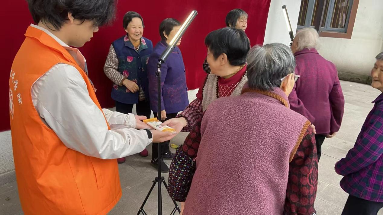 本次活动还为老人们安排了拍摄纪念照的环节。在摄影师为每位老人定格下美好瞬间后,志愿者们会将一份份精心准备的面条作为慰问品送到老人手中。 这不仅仅是一份简单的礼品,更承载着学院师生对老人们健康长寿、幸福美满的深切祝福。接过这份“暖心面”,老人们连声道谢,现场气氛温馨而感人。