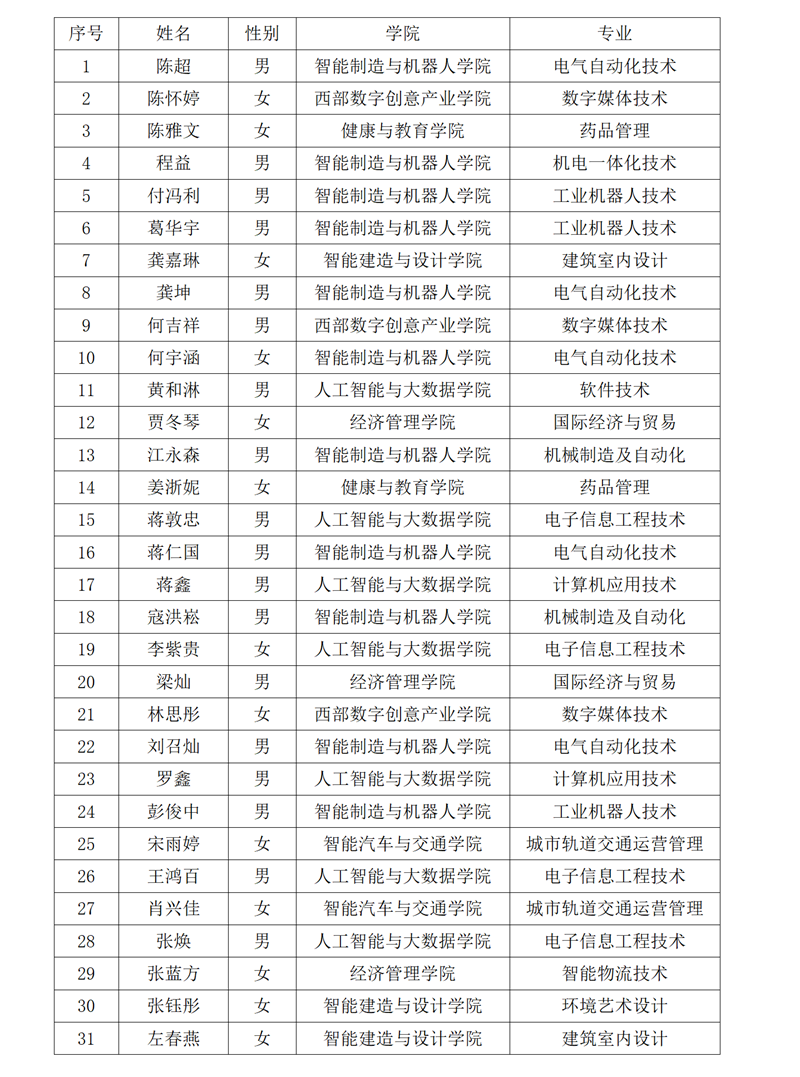 根据重庆市教育委员会《关于做好2024—2025学年普通高校本专科生国家奖学金评审工作的通知》(渝教财函〔2025〕78号)、重庆科创职业学院《关于开展国家奖学金、国家励志奖学金评选工作的通知》(重科创学〔2025〕127号)等文件精神,按照国家奖学金评审办法,在公开、公平、公正的原则下进行,由学生本人申请,经民主评议,二级学院推荐,学生工作部复核,学校奖学金评审委员会评审等环节,现就陈超等31名拟推荐获奖人员名单予以公示。公示时间为2025年10月12日-2025年10月18日,公示期5个工作日。