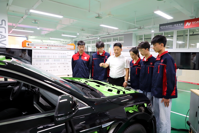 学生正在研究由我校办企业乐凯机器人公司生产制造的大型机甲...