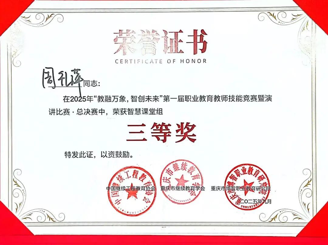 9月19日,由重庆市继续教育学会与重庆市博智职业教育研究院联合主办的"第一届职业教育教师技能竞赛暨演讲比赛总决赛”在重庆圆满落幕。我校人工智能与大数据学院教师周礼萍在"智慧课堂"赛项中凭借作品《智启VUE3:AI助力个性化定制》荣获全国三等奖,展现出优异的竞技水平。