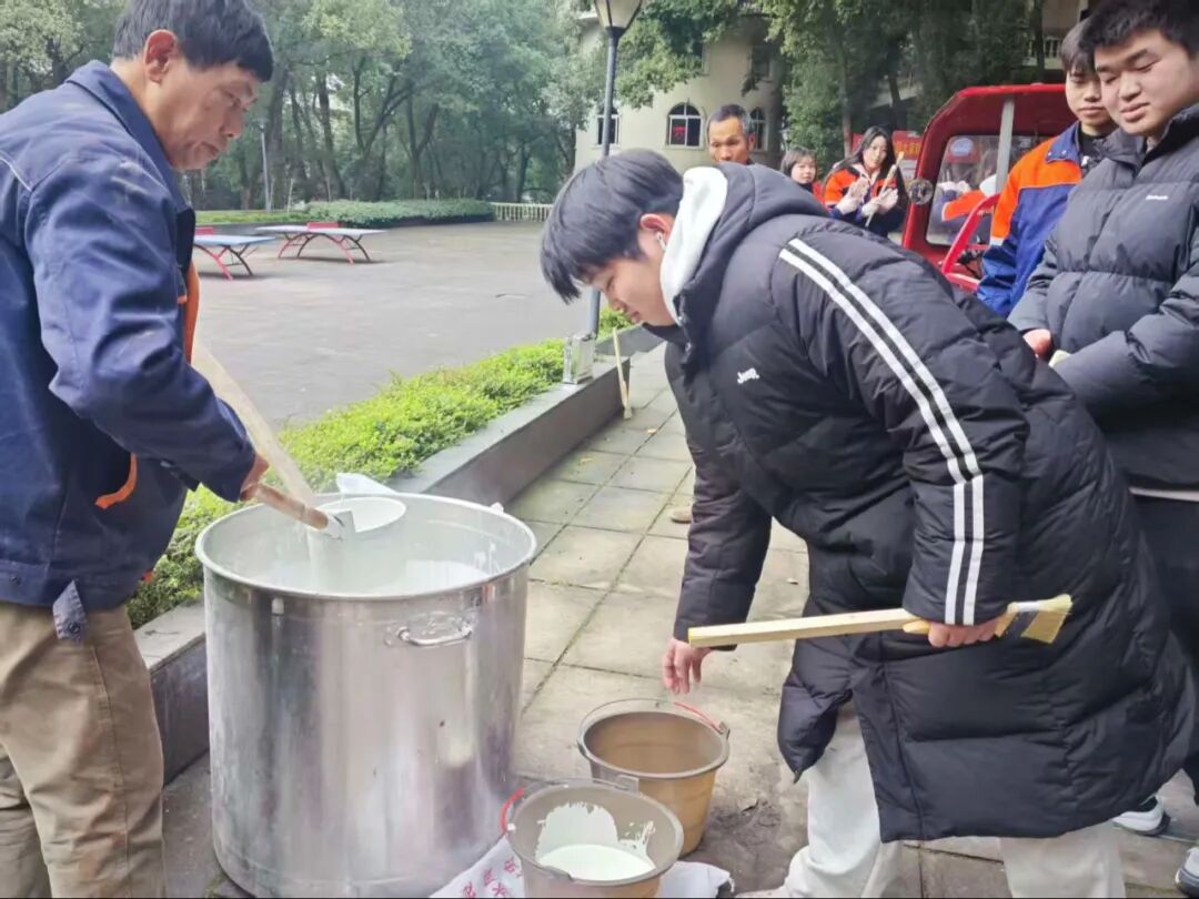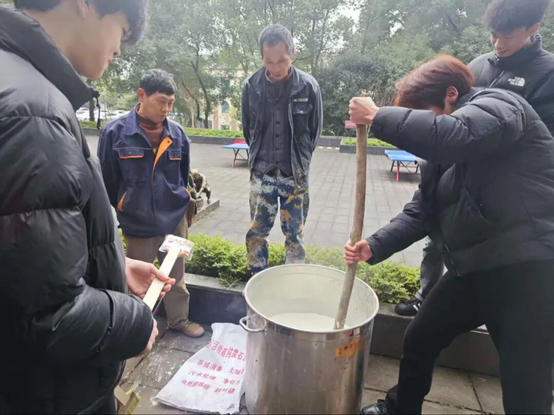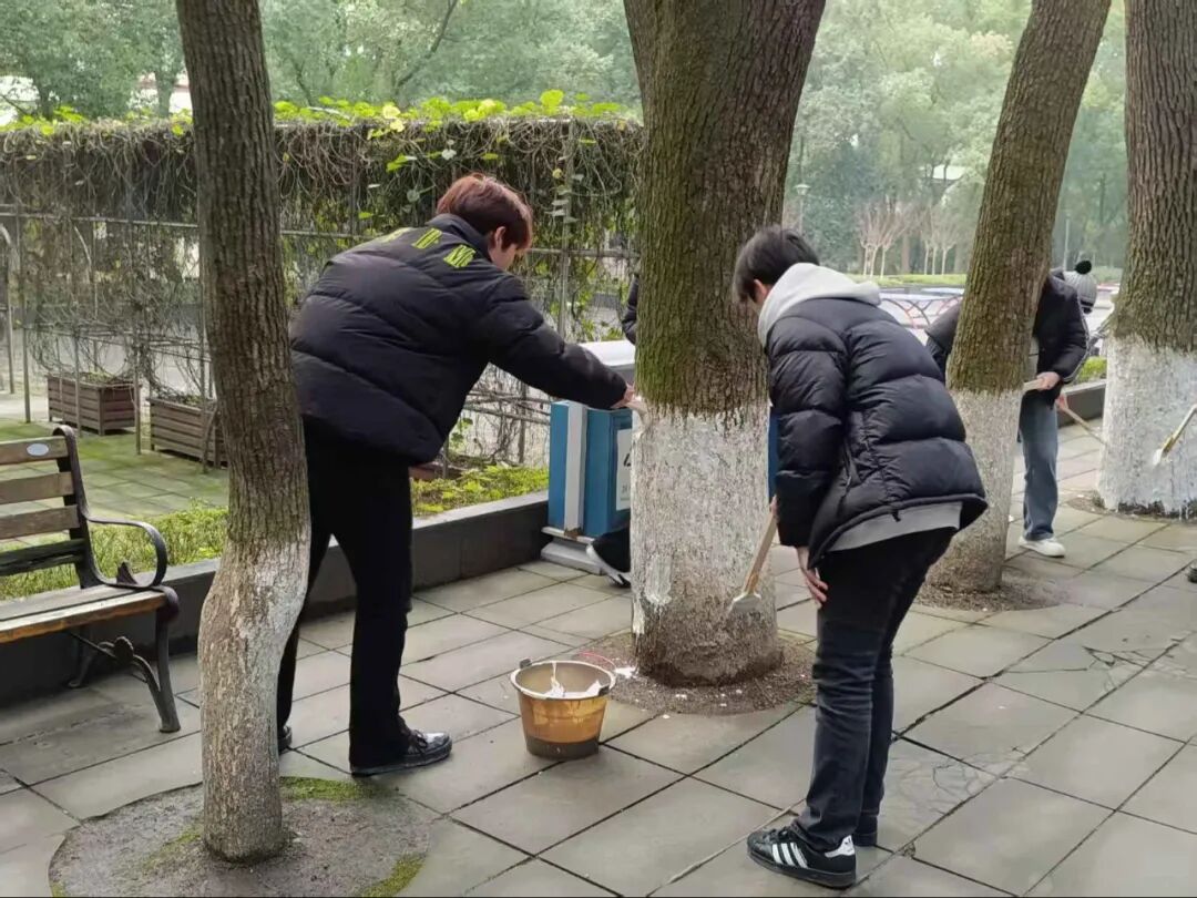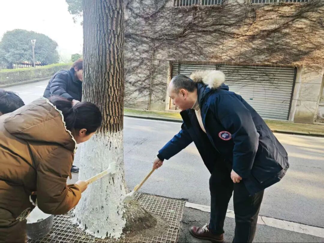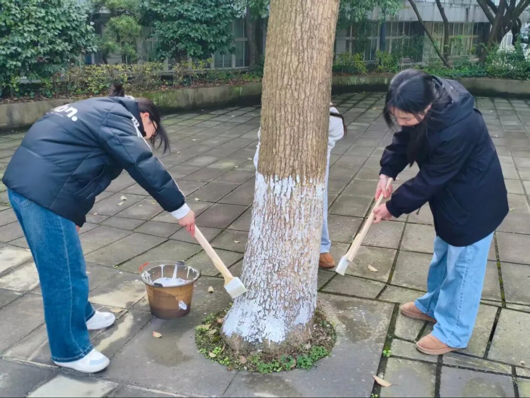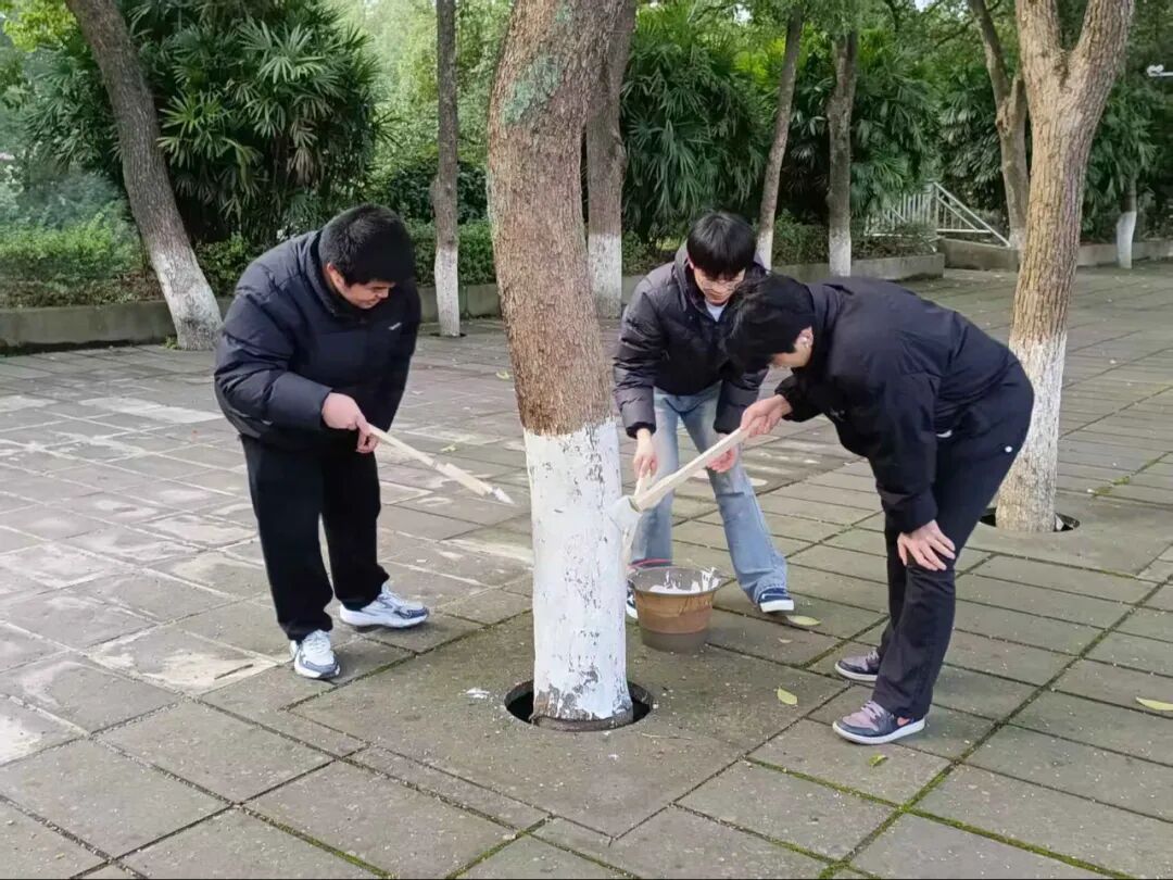 冬日寒意未消,但志愿者们的服务热忱丝毫不减。林荫道间,青年学子们忙碌的身影穿梭其间,通过系统化的树干涂白作业,原本粗粝的树干渐渐被规整的防护涂层覆盖。大家分工协作、热情高涨,默契配合完成每一项流程,忙碌有序的身影与校园林木相映成趣,勾勒出一道充满生机与温情的校园人文风景线。