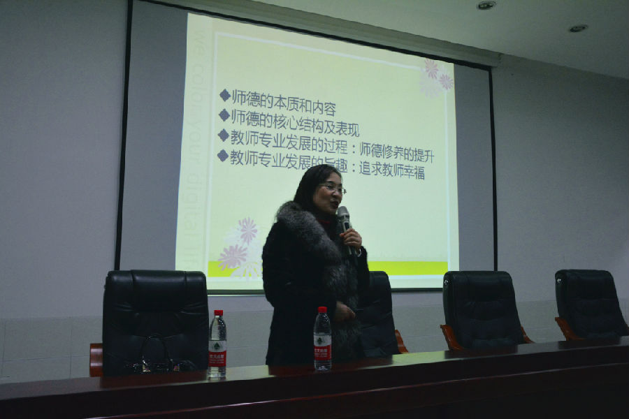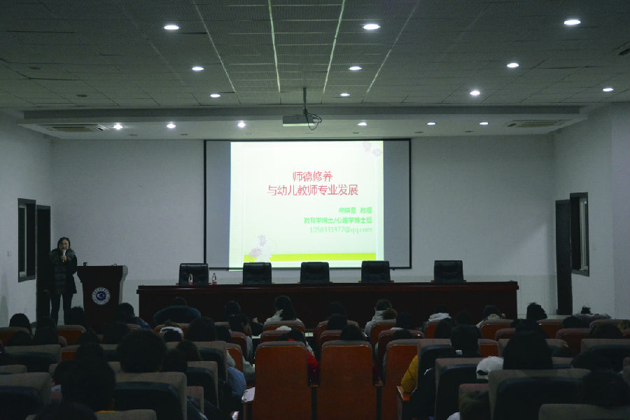 讲座上,牟教授围绕师德的本质和内容、师德的核心结构和表现、教师专业发展的过程及教师专业发展的旨趣四个方面具体开展。牟教授用大量的实践案例,分析幼儿教师职业道德,幼儿教师发展的方向、理念以及职业规划,并对幼儿教师职业价值和评价体系做了深入剖析。牟教授的讲座以风趣的语言和实际案例帮助同学们更清晰的认识到幼儿教师师德规范的内容,让同学们深刻认识到一名优秀的幼儿教师要做到关爱幼儿,严谨笃学,淡泊名利,自尊自律,以人格魅力和学识魅力教育感染幼儿,做幼儿健康成长的指导者和引路人。